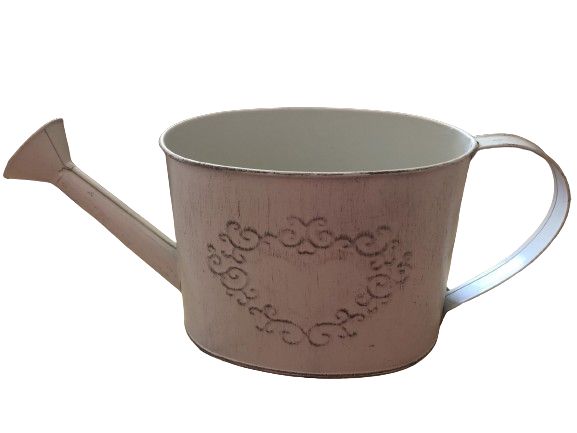 Plechový obal béžové barvy v retro stylu, zdobený srdíčkem. Obal v podobě konvičky.